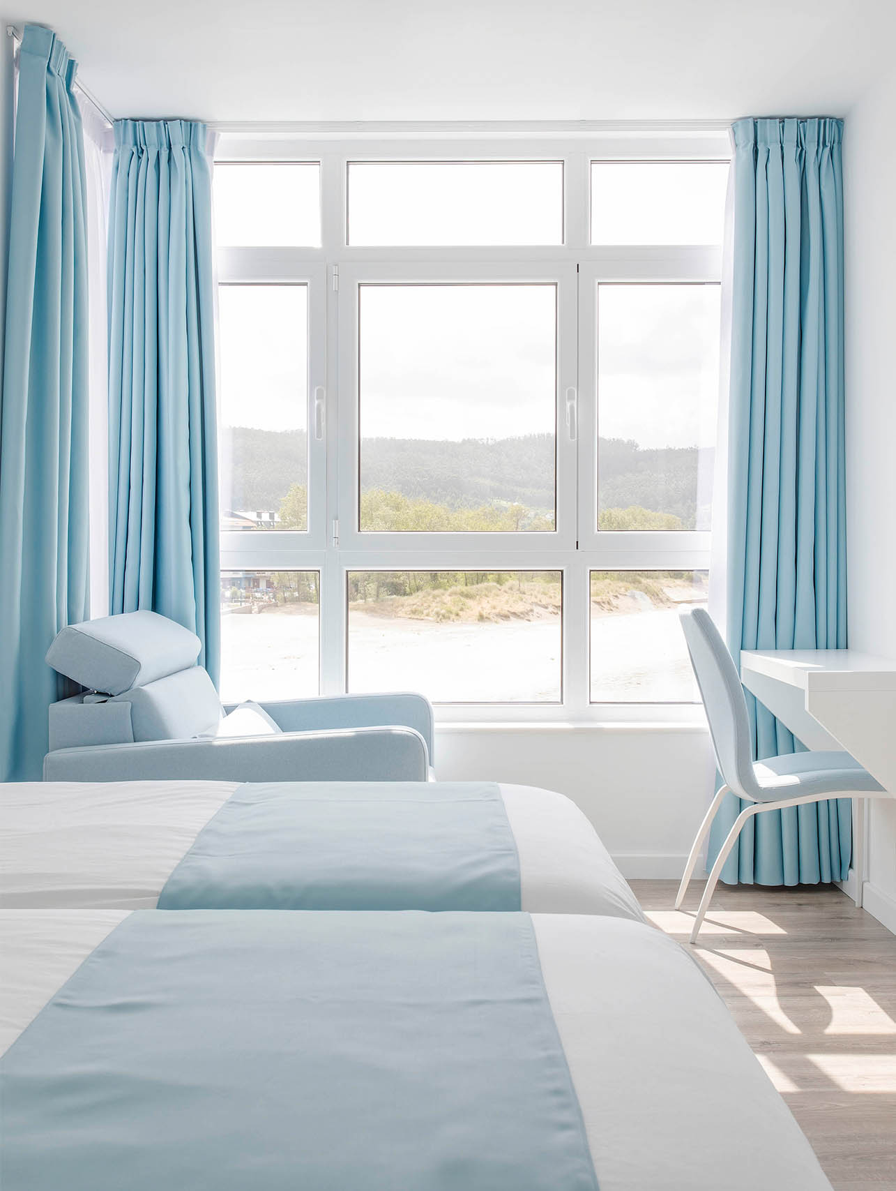 Habitación ubicada en la tercera planta, con grandes ventanales y vistas al mar.